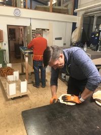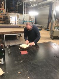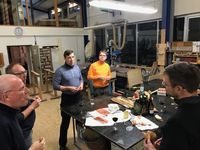 Und mit dieser positiven Erfahrung sind wir gleich in die zweite Runde gestartet. Andreas Brosy hatte bereits eine weitere Auflage geschnitten und getrocknet, so dass wir nun mit nahezu schlafwandlerischer Routine am 21. und 22. November in der Werkstatt die nächste Charge Eibenscheiben zu Gunsten des Hospiz aufbereiten konnten. Dank klarer Ansagen und harmonischem Miteinander konnten Andreas, Alexander, Bart sowie unsere Gäste Patrick Thurm und Frank Eden in nicht mal 3 Stunden nahezu 80 Eibenscheiben fertigstellen.