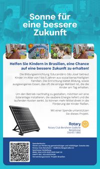 Um den Betrieb nachhaltig zu gestalten, möchten wir eine Solaranlage installieren, die saubere Energie liefert und die laufenden Kosten senkt. Die Anlage wird aus Solarmodulen mit 710 W Leistung bestehen und wird insgesamt ca. 3.050 kWh pro Monat liefern. So können mehr Mittel direkt in die Förderung der Kinder fließen. Für die Installation haben wir in Brasilien professionelle Partner beauftragt, unser Clubmitglied Larissa Lima-Znaidi wird bei der Montage vor Ort in Brasilien sein.